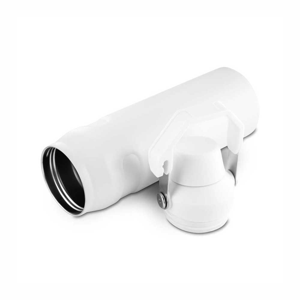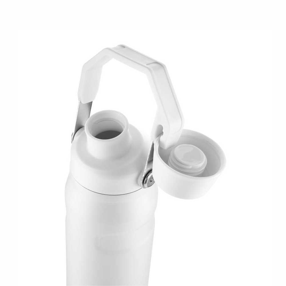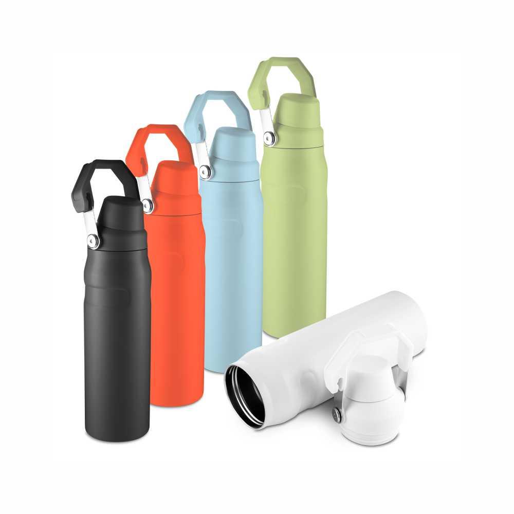 Garrafa térmica de 750 ml com parede dupla em inox (interno 304 / externo 201), pintura a pó e tampa em plástico PP. A tampa é removível e pode ser encaixada na alça.