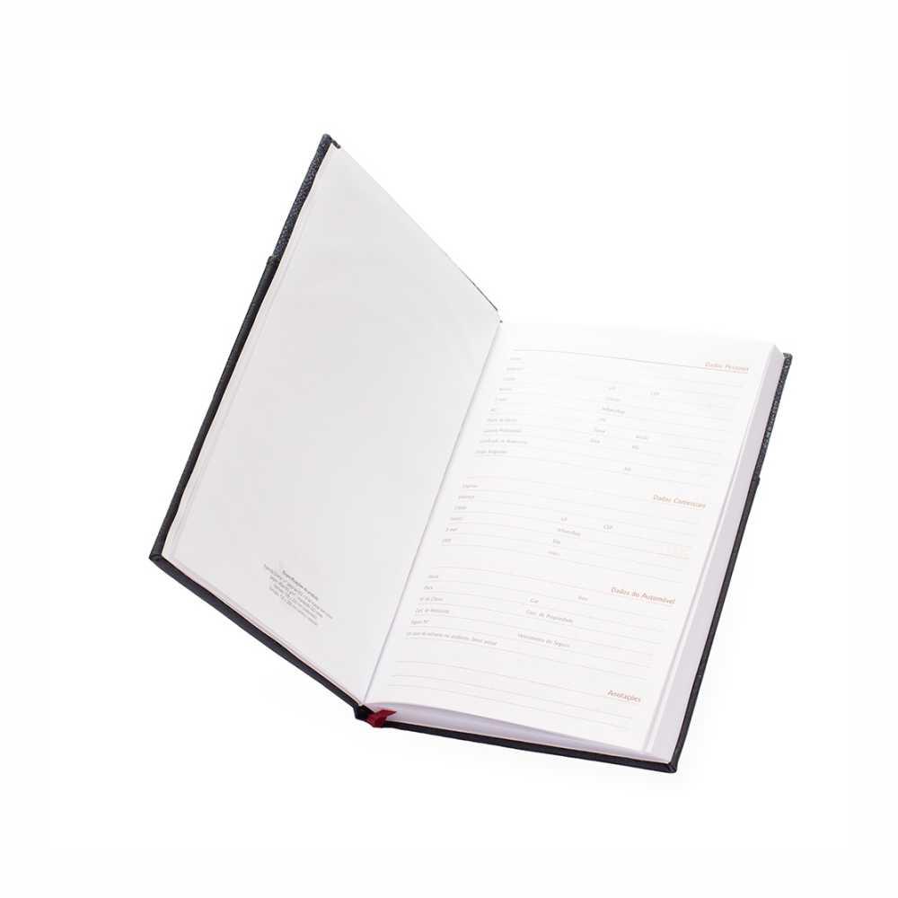 Agenda 2026 com capa dura em poliuretano (PU) e marcador de páginas em cetim. Possui páginas dedicadas a dados pessoais, calendários de 2026 a 2028, lista de contatos e itens de conversão de unidades de medidas, códigos DDD e DDI e mapas.