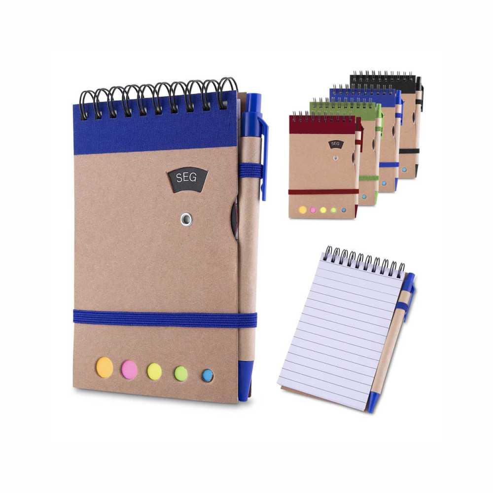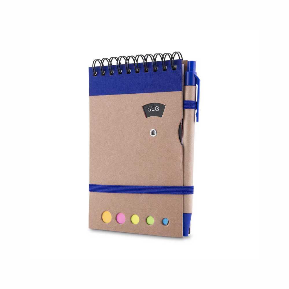Bloco Ecológico com a capa em papel kraft, com 70 folhas pautadas e blocos adesivos (sticky notes) coloridos. Acompanha disco rotativo na capa com os dias da semana e caneta produzida em papelão reciclado com detalhes em plástico e escrita em azul.