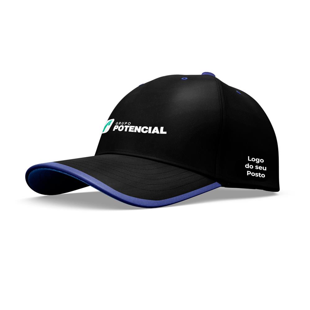 Boné Americano Preto com detalhes e verso da aba em azul com marca da Potencial na frente e nome do posto na lateral