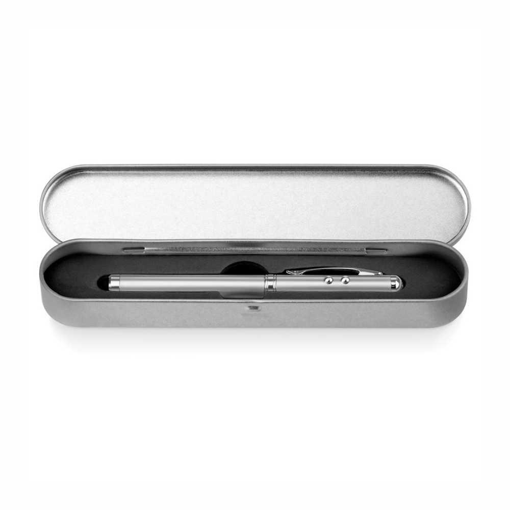 Caneta Esferográfica multifunções em metal com clipe de metal. Esferográfica com mini lanterna LED, apontador laser e ponteira touch. Incluso 3 pilhas LR41. Escrita em azul. Fornecida em estojo metálico com forro de veludo