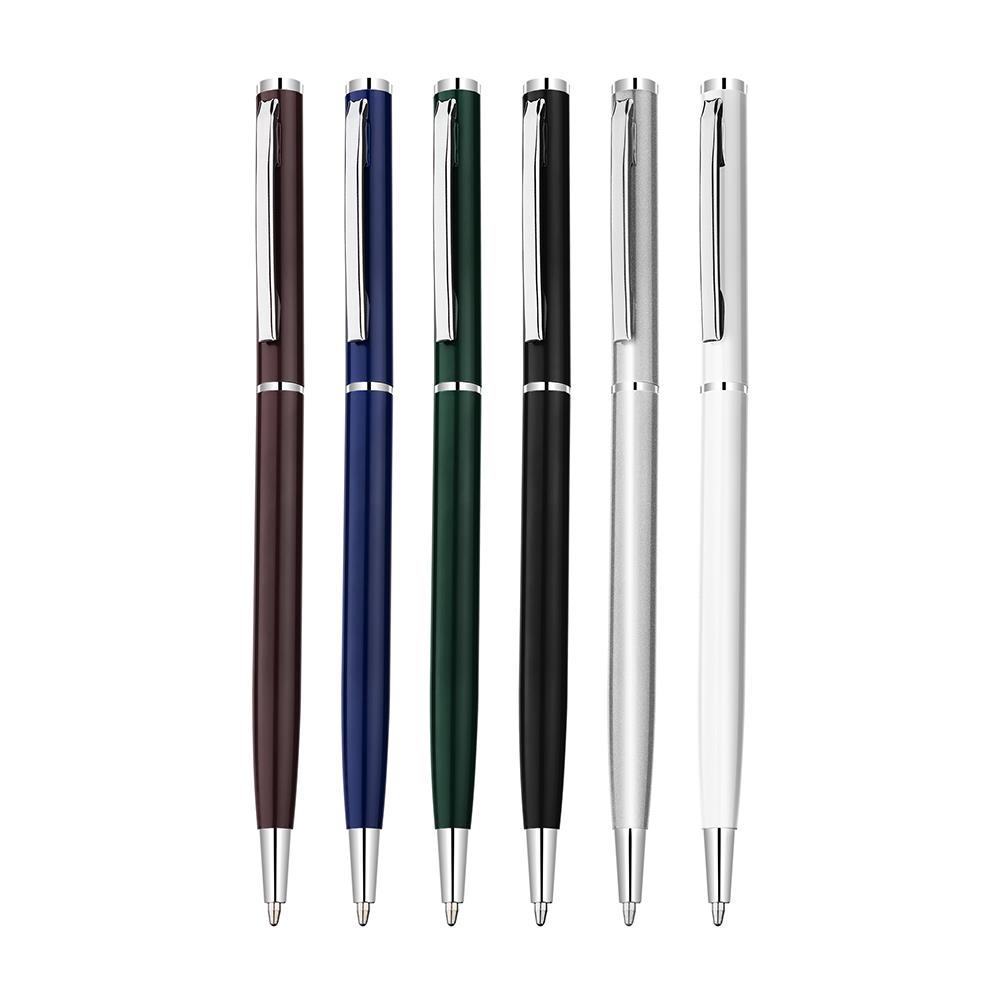Caneta esferográfica em metal com escrita em azul, detalhe brilhoso.