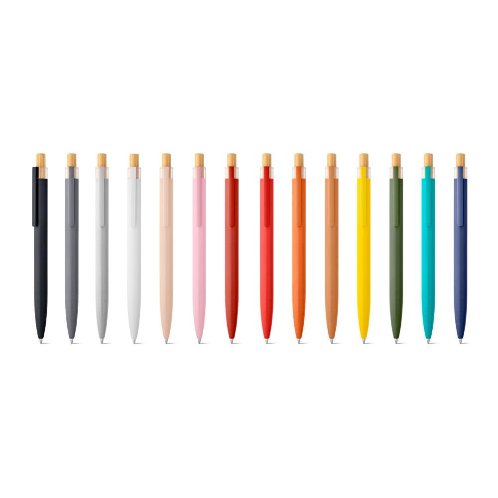Caneta esferográfica com corpo em alumínio 100% reciclado, topo em PET reciclado, botão em bambu e clipe de metal. Escrita em tinta azul com autonomia de até 1,5 km. Por conter bambu, cor e impressão podem variar.