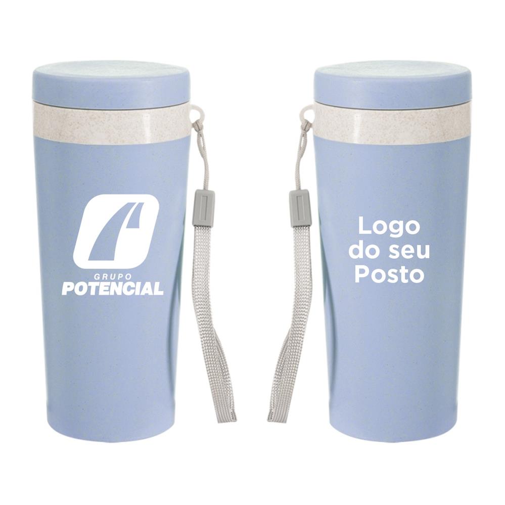 Copo produzido em polipropileno livre de BPA, possui uma tampa de vedação rosqueável e alça de nylon (removível) para transporte.