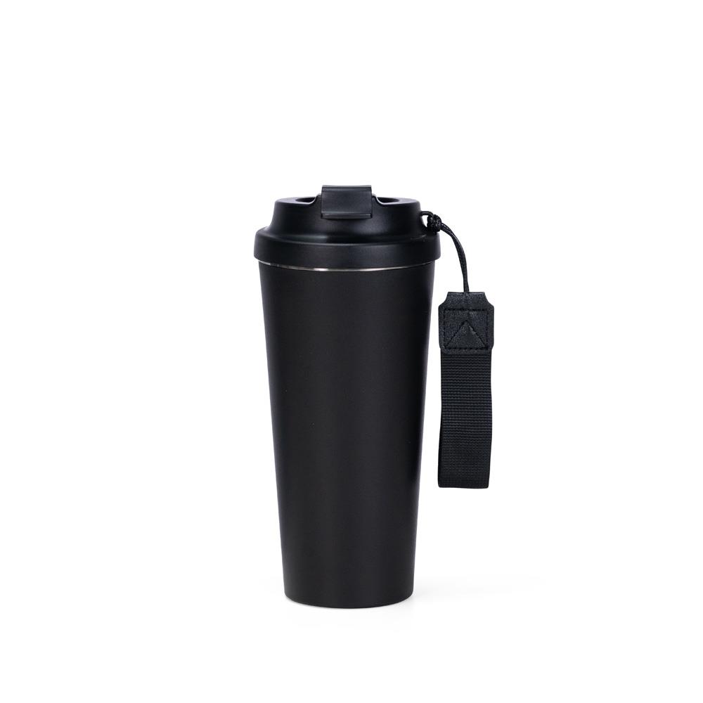 Copo em inox 304 com revestimento externo em polipropileno (PP) e capacidade para até 480ml. Apresenta tampa rosqueável em PP livre de BPA com protetor para o bocal. Acompanha alça em nylon com detalhe em couro sintético para transporte.