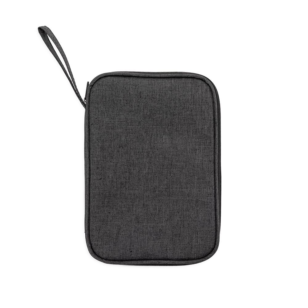 Estojo confeccionado em poliéster resistente à água. Conta com bolso interno em tela de nylon e fechamento em zíper e divisórias em diferentes tamanhos em elástico. Possui alça de mão para transporte.