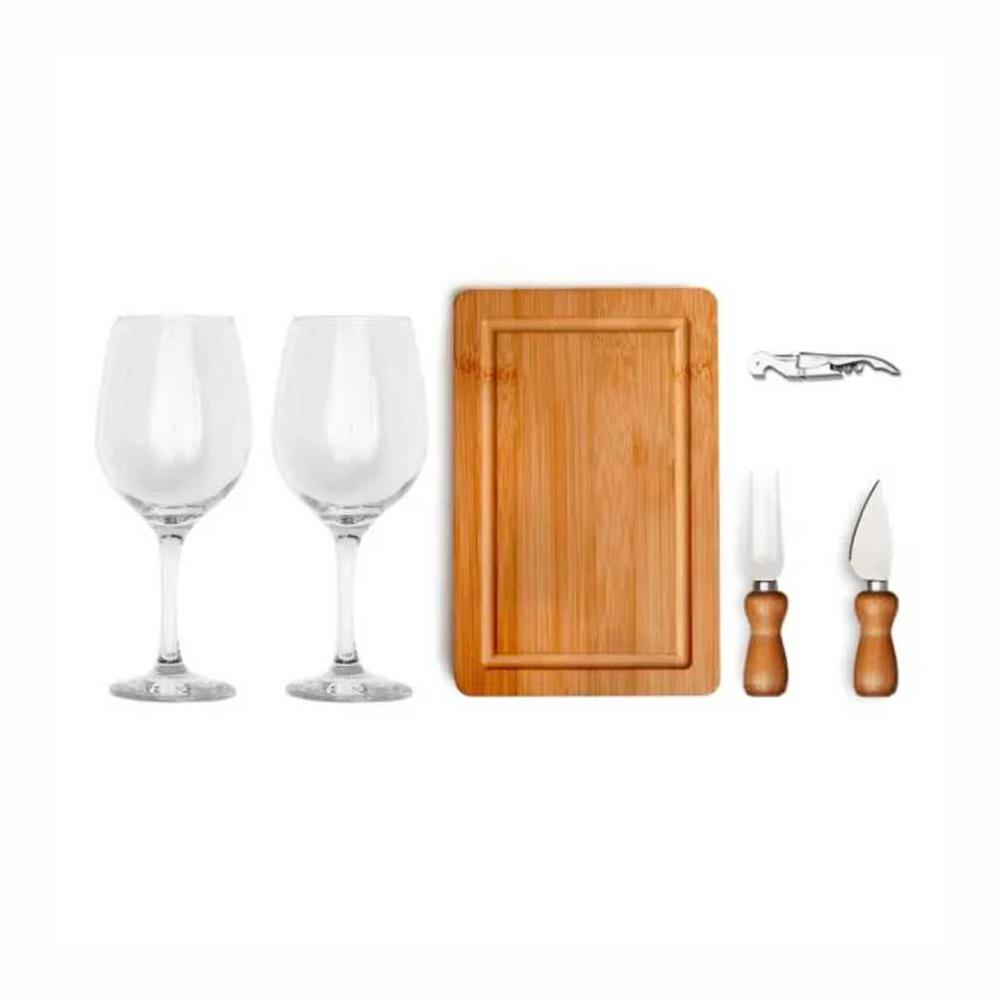 Kit Queijo e Vinho. Composto por tábua retangular para queijo em Bambu; faca com ponta e garfo em Madeira/Inox; abridor saca-rolhas em aço Inox escovado e duas taças para Vinho em vidro.