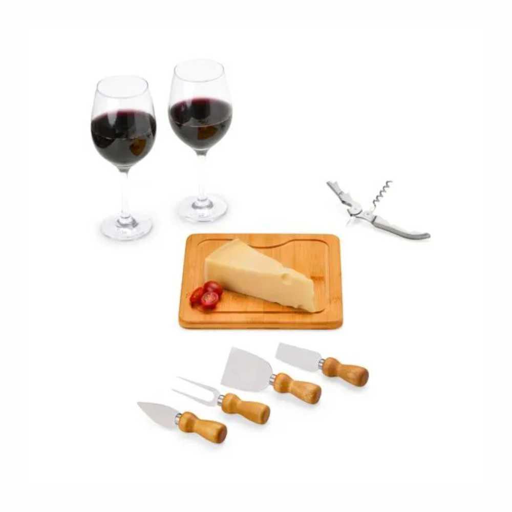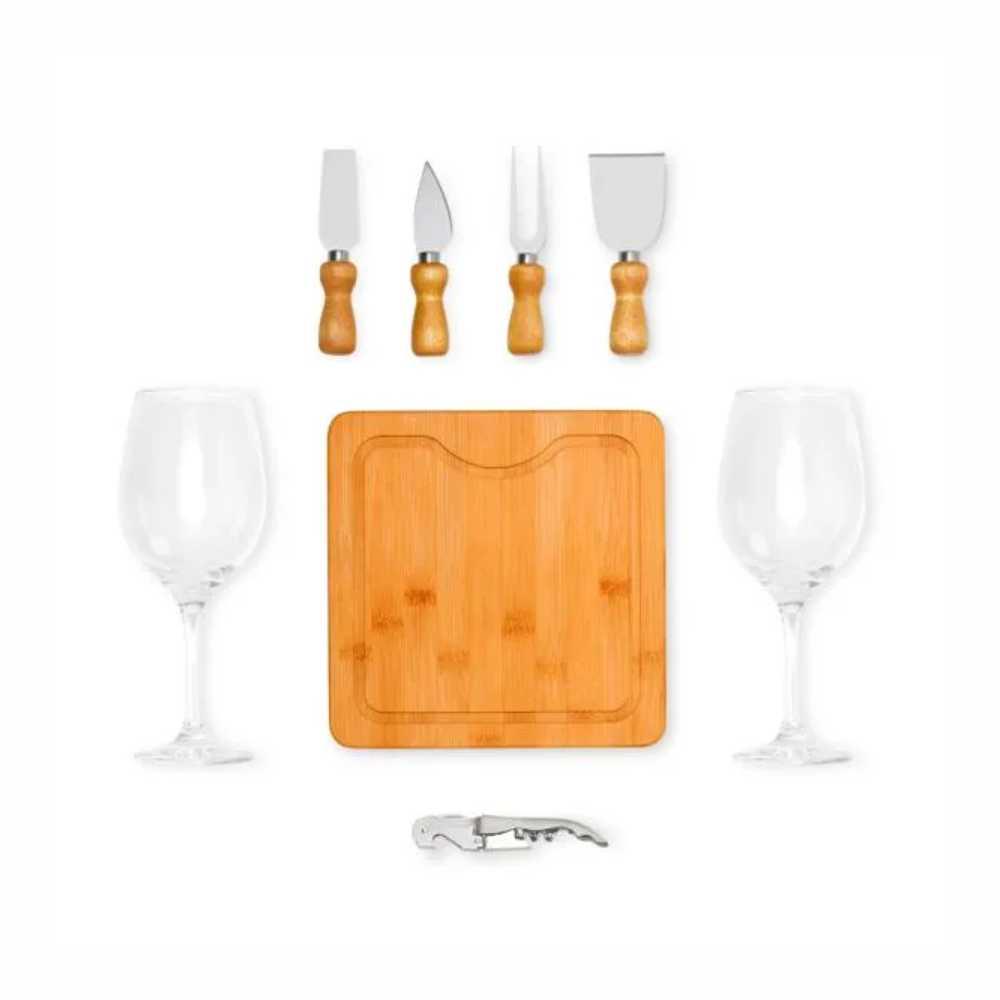 Composto por tábua em Bambu quadrada para Queijo/Petisco; duas facas, sendo, uma com ponta e outra reta, garfo e espátula em Madeira/Inox; duas taças em vidro para Vinho e abridor saca-rolhas em aço Inox escovado.