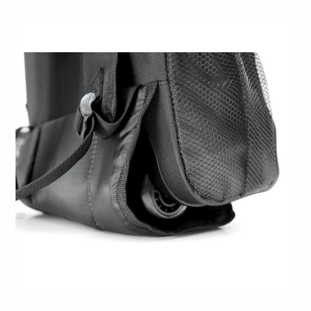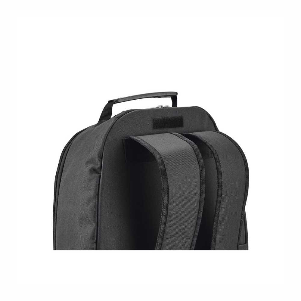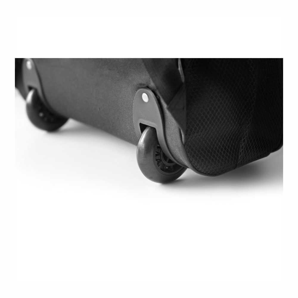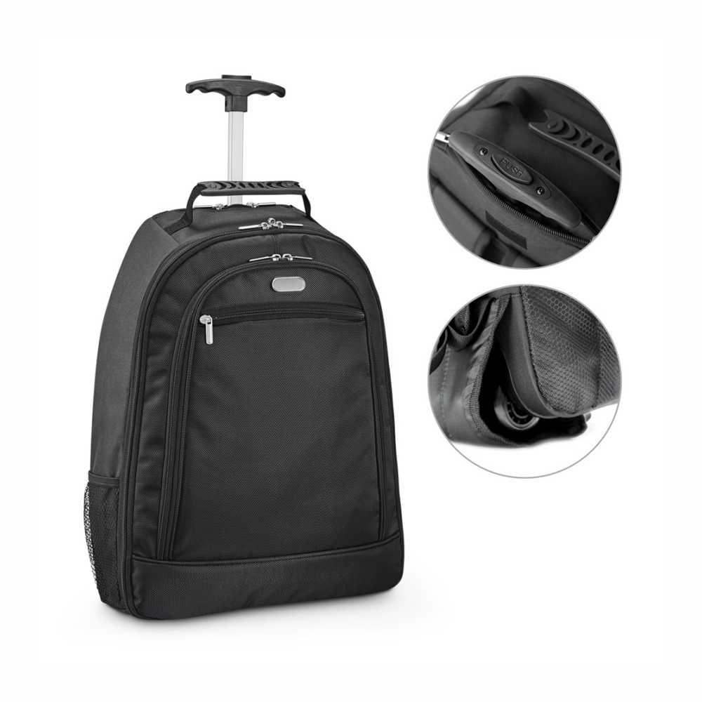 Mochila com rodinhas para notebook em 1680D e 300D com 2 rodas. Possui um compartimento principal almofadado para notebook até 15.6’’, compartimento forrado e diversos bolsos. Bolso frontal com zíper e bolsos laterais em tela mesh. O trolley tem protetor de rodas, alças almofadadas e pega extensível em metal com mola (altura da pega estendida até 530 mm). Placa metálica removível com imã para fácil gravação. Capacidade até 24 L e peso de 1,65 kg