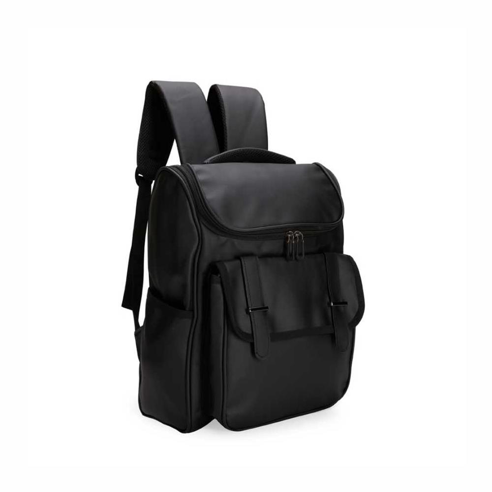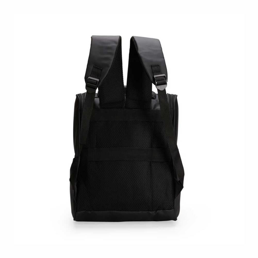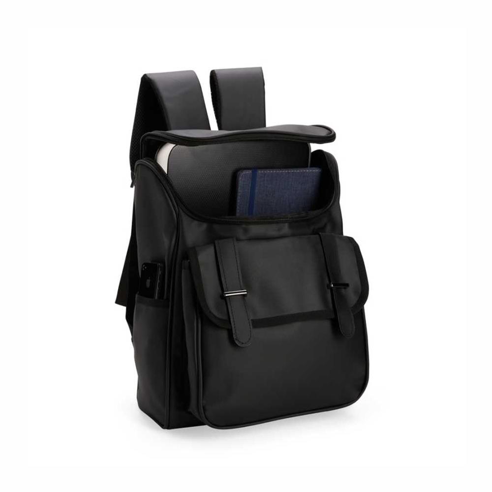 Mochila confeccionada em couro sintético impermeável com capacidade de até 18 litros. Possui compartimento interno para notebook de até 13 polegadas. Apresenta compartimento frontal com par de fivelas e fechamento em botões magnéticos, além de dois bolsos laterais. Possui área das costas e alças de mão e de costas com revestimento em tecido respirável.
