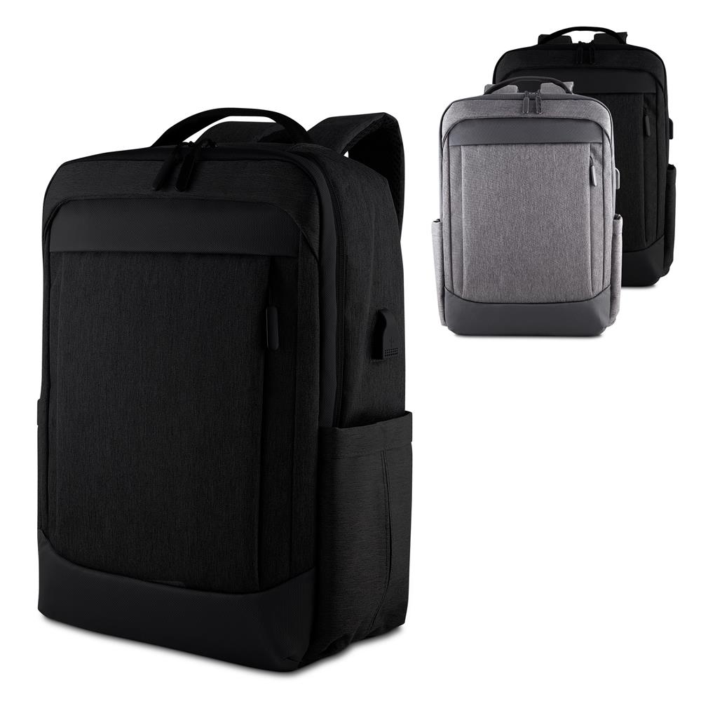 Mochila em tecido Oxford com detalhe em PU e interior em poliéster 190D, capacidade de 21L. Possui conector USB lateral, bolso frontal com zíper, dois bolsos laterais, compartimento interno para notebook de até 15,6” e tablet, divisórias internas, alça de mão, alça de ombro acolchoada e engate para mala de viagem.