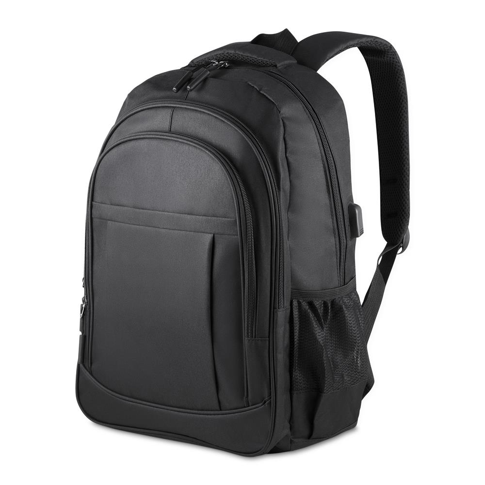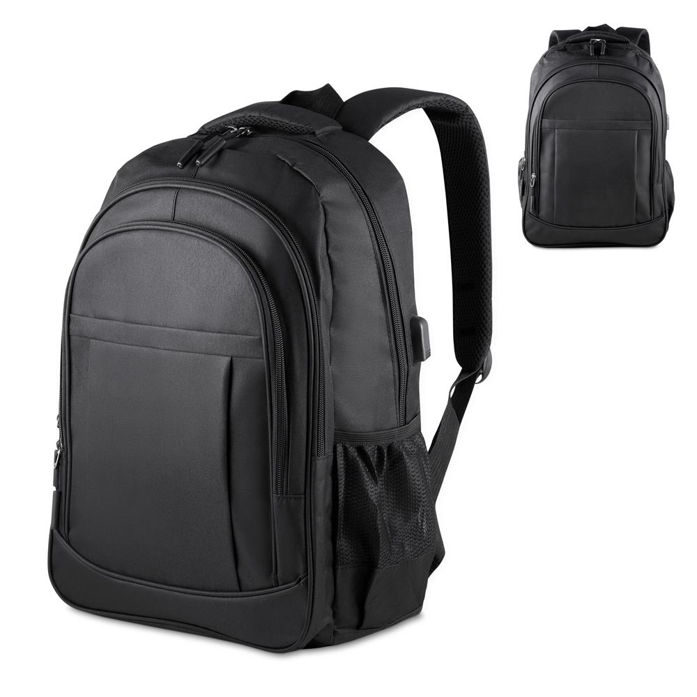 Mochila confeccionada em tecido externo de poliéster 300D e tecido interno de poliéster 190D, com capacidade total de 23 litros. Possui três bolsos frontais com zíper, compartimento principal com fechamento em zíper, dois bolsos laterais, conector USB e engate para mala de viagem. Conta ainda com compartimento interno próprio para notebooks de até 15,6".