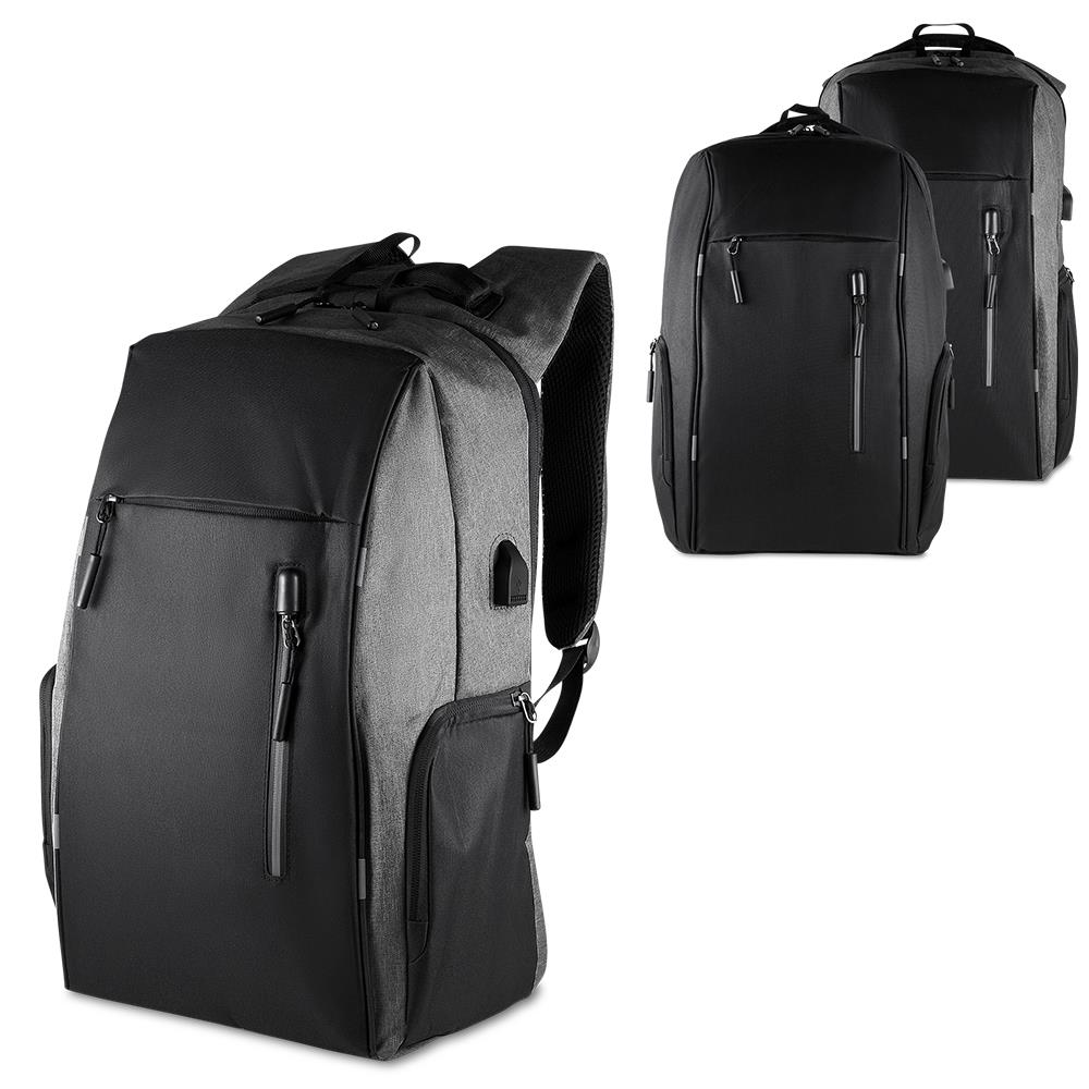 Mochila em poliéster 300D com forro em poliéster 190D, capacidade de 24 litros. Conta com faixa reflexiva nas alças de ombro e na parte da frente, engate para mala de viagem, conector USB lateral, dois bolsos laterais com zíper, dois bolsos frontais com zíper, duas alças de mão e compartimentos internos para notebook de até 15,6” e pequenos objetos.
