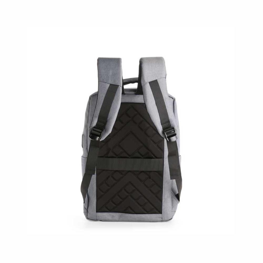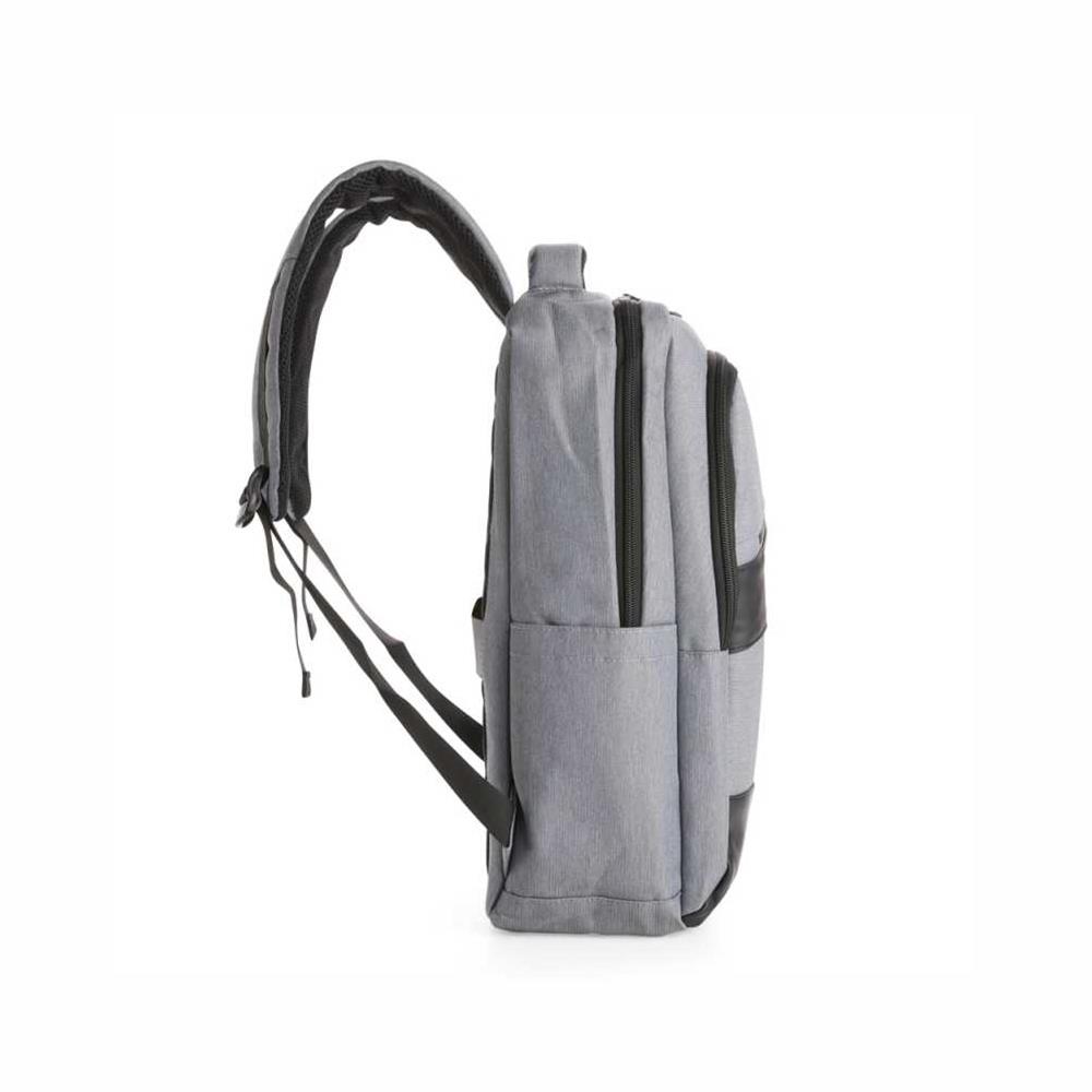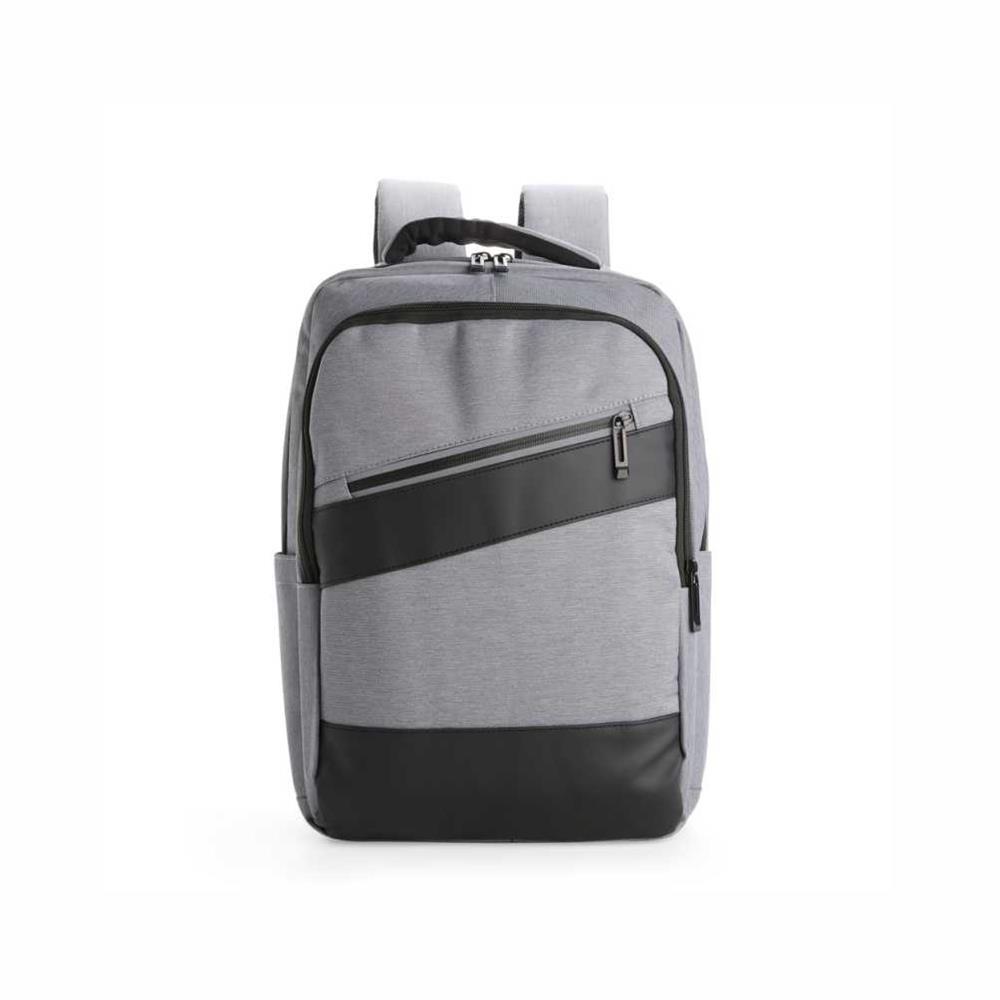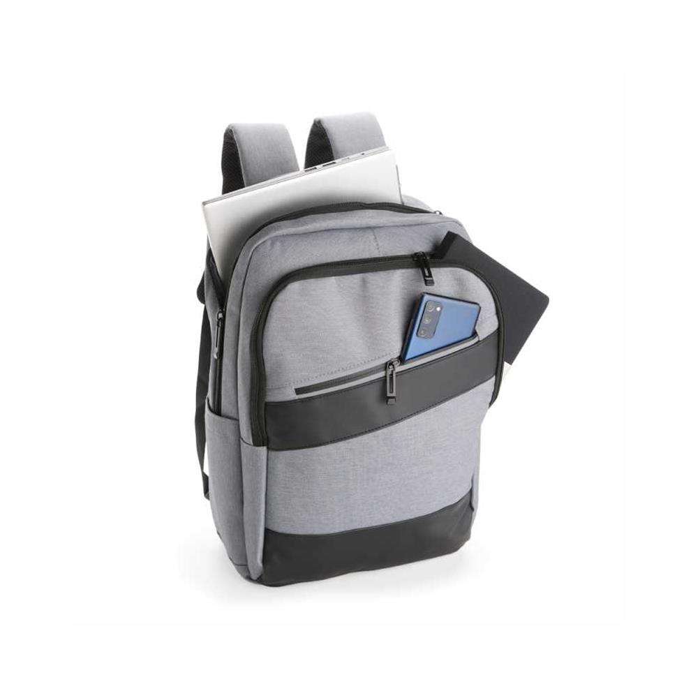 Mochila confeccionada em Oxford Jacquard impermeável com detalhes em couro sintético e capacidade de até 15,6 litros. Possui compartimento principal com bolsos em diferentes tamanhos e uma divisória para notebooks de até 15,3 polegadas. Conta com entrada externa para cabos USB-A e USB-C, dois compartimentos frontais com zíper e dois bolsos laterais abertos. Dispõe ainda de alça superior, duas alças de costas e painel traseiro acolchoados, além de engate em nylon para malas de viagem.