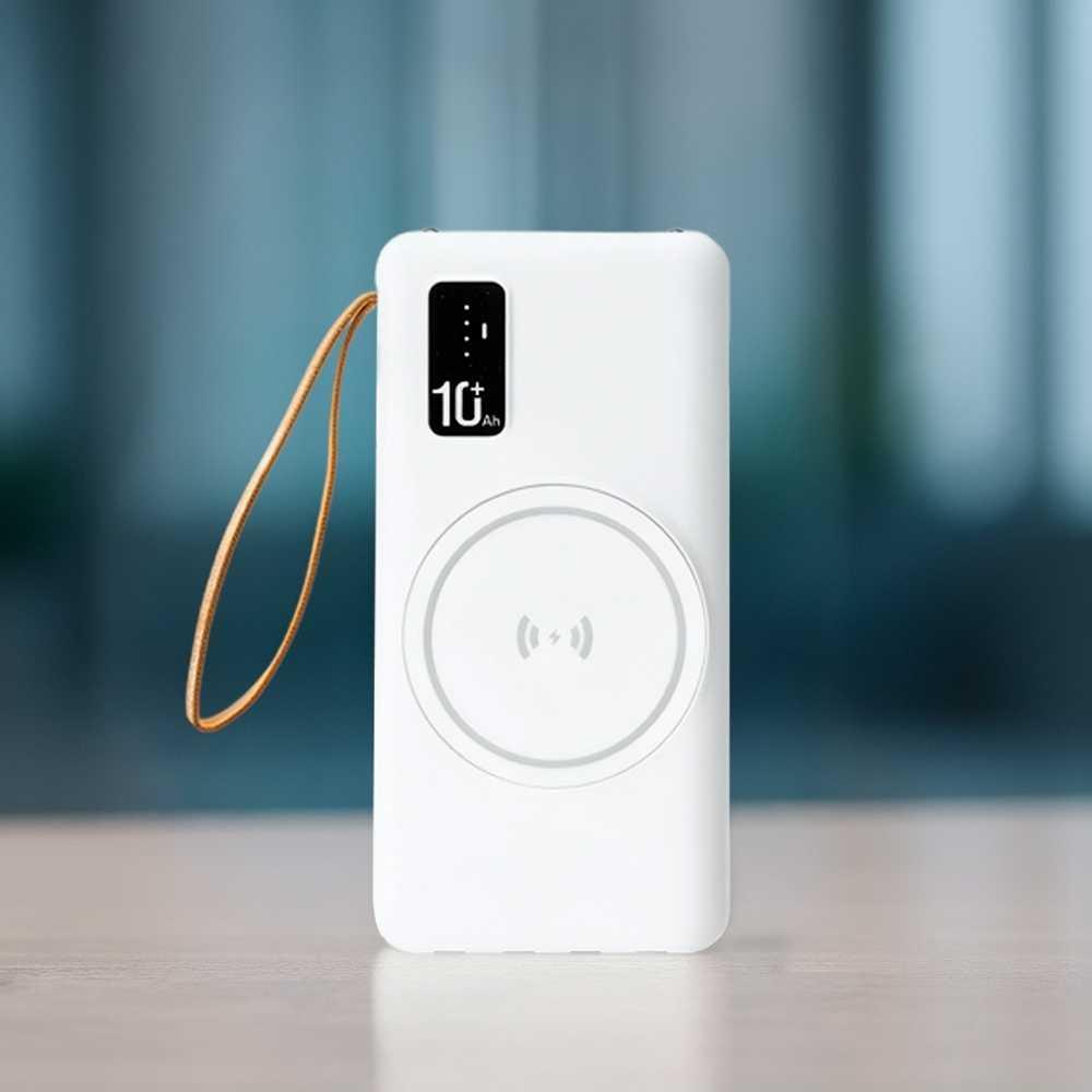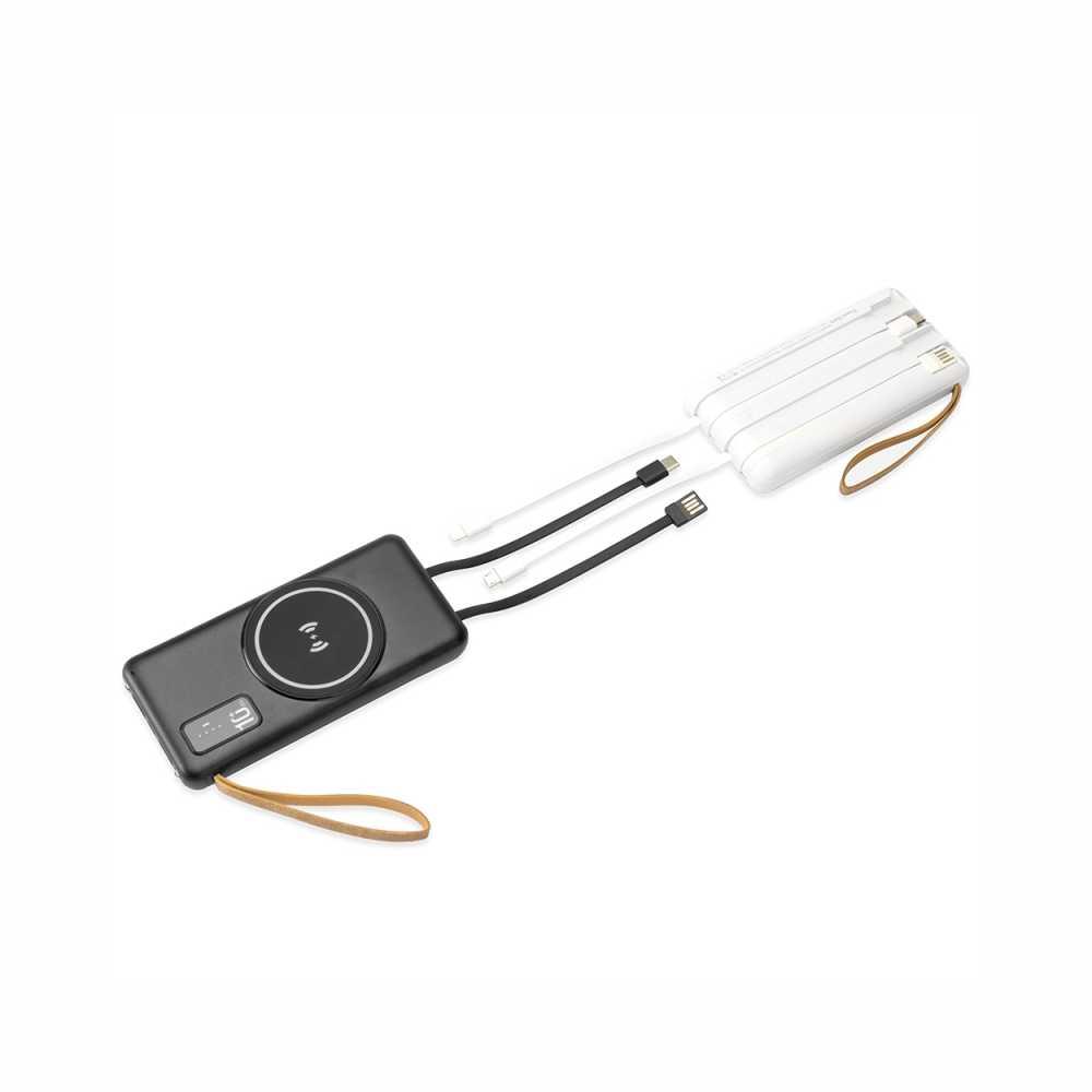 Power Bank em plástico com capacidade de 10.000mAh. Possui quatro cabos integrados com saídas para Lightning, USB-C, Micro-USB e USB, além de área de recarga por indução magnética para dispositivos compatíveis e lanterna de LED. Conta ainda com entradas USB-A e USB-C para recarga do próprio aparelho e alça de tecido sintético para transporte.