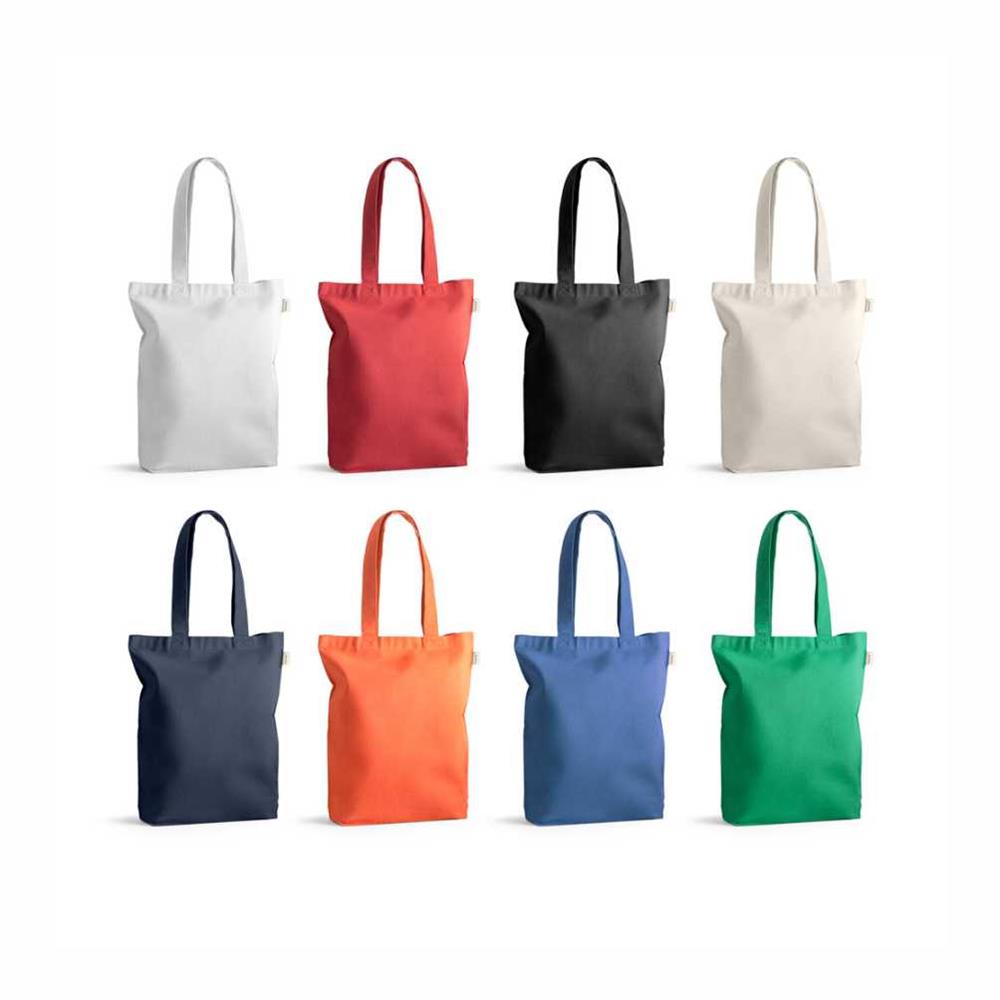 Sacola em 70% algodão reciclado e 30% poliéster reciclado (220g/m²), com alças de 65 cm. O tecido é sem tingimento, e utilizado na sua cor original, sem produtos químicos de tingimento ou branqueamento, contribuindo para um menor impacto ambiental.