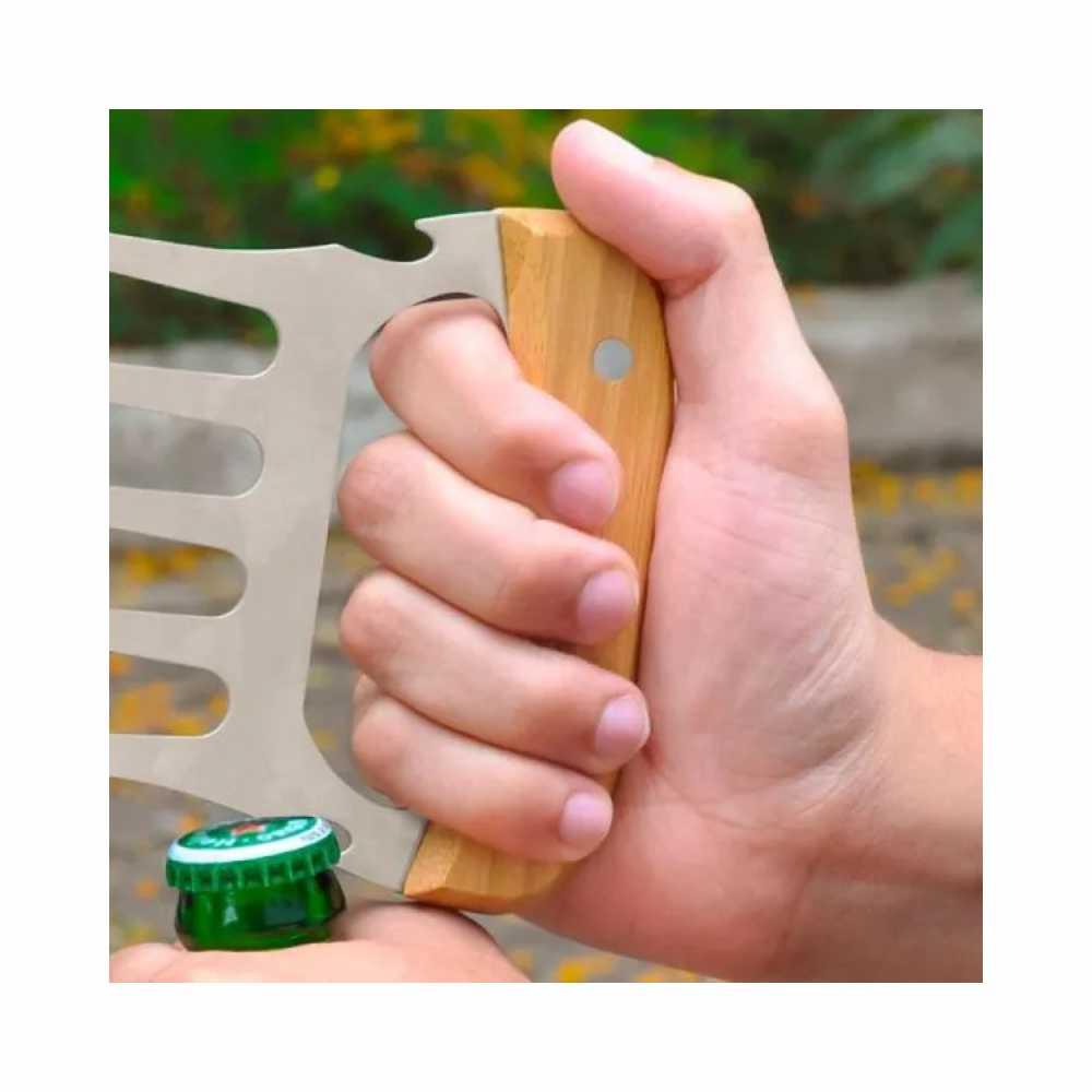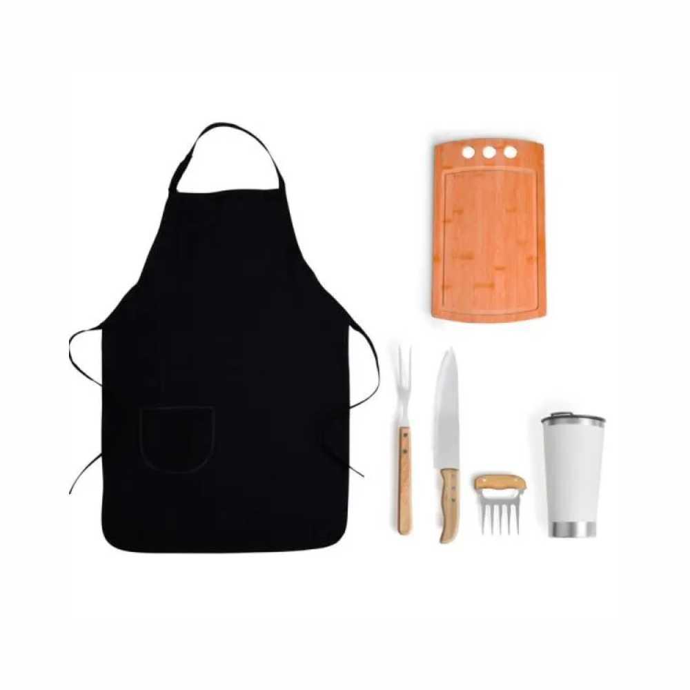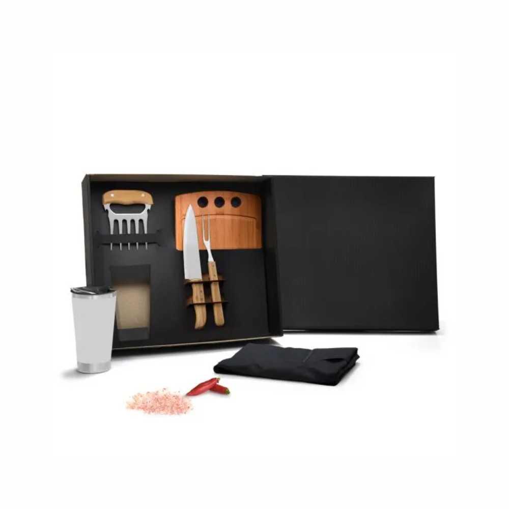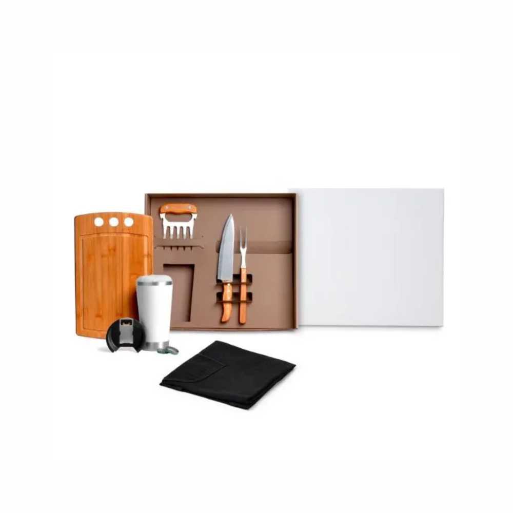 Personalização: Uma gravação a Laser na tábua, lâmina da faca, no garfo 5 dentes, copo e abridor; Silk Screen na tampa da caixa e no avental.