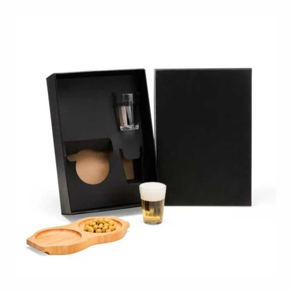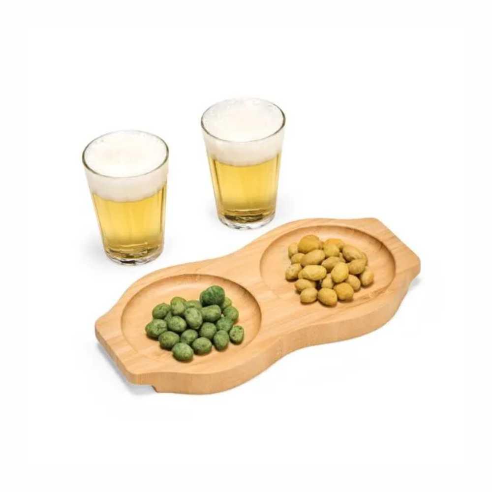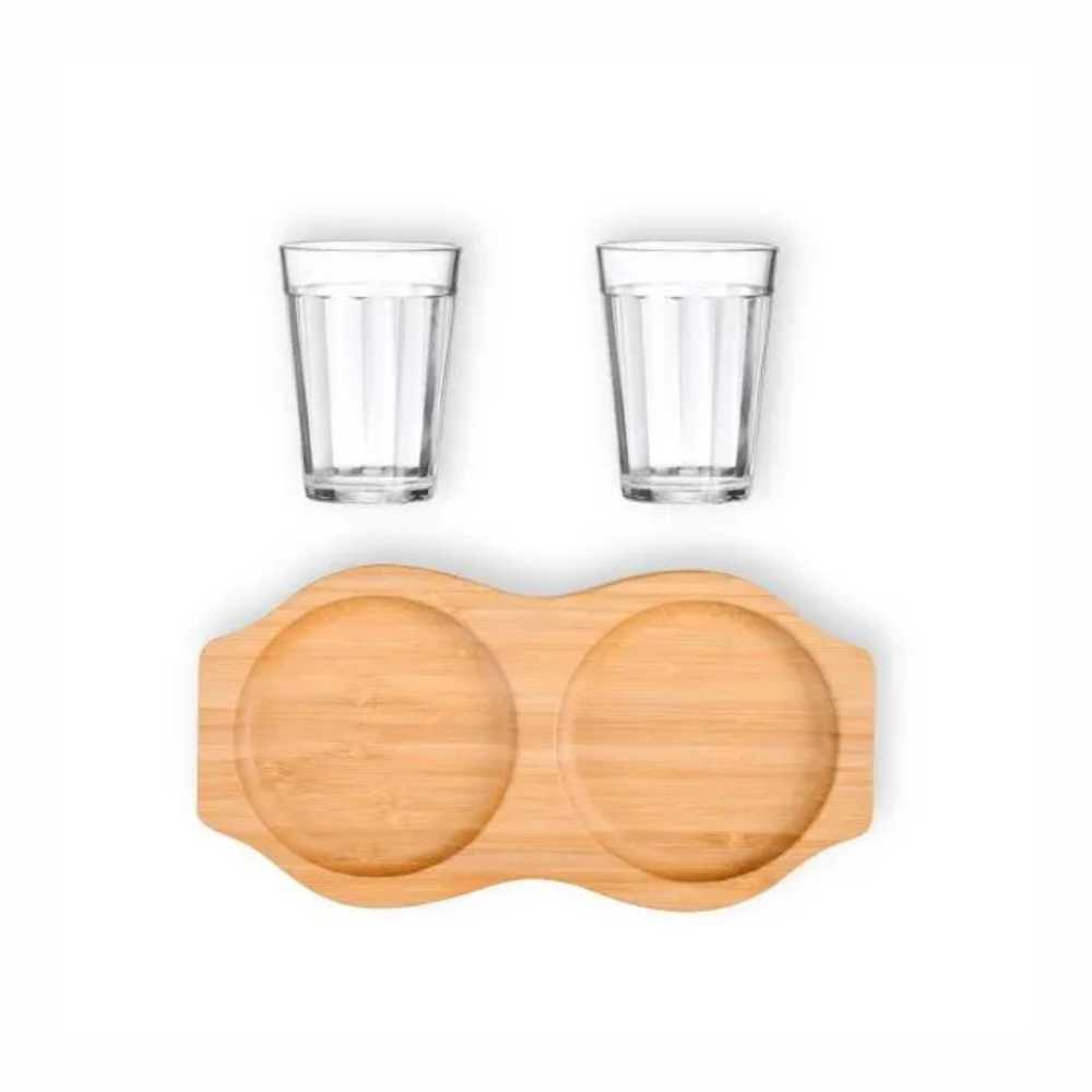 Kit Petisqueira composto por Petisqueira em Bambu com dois espaços e dois copos americanos multiuso em vidro.