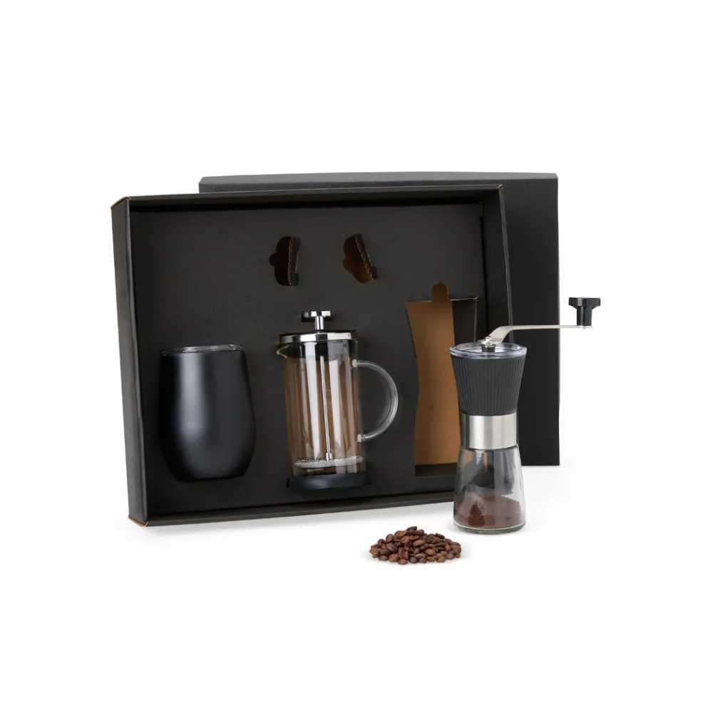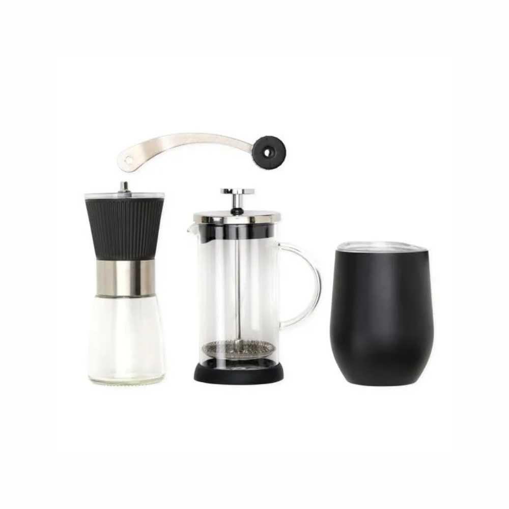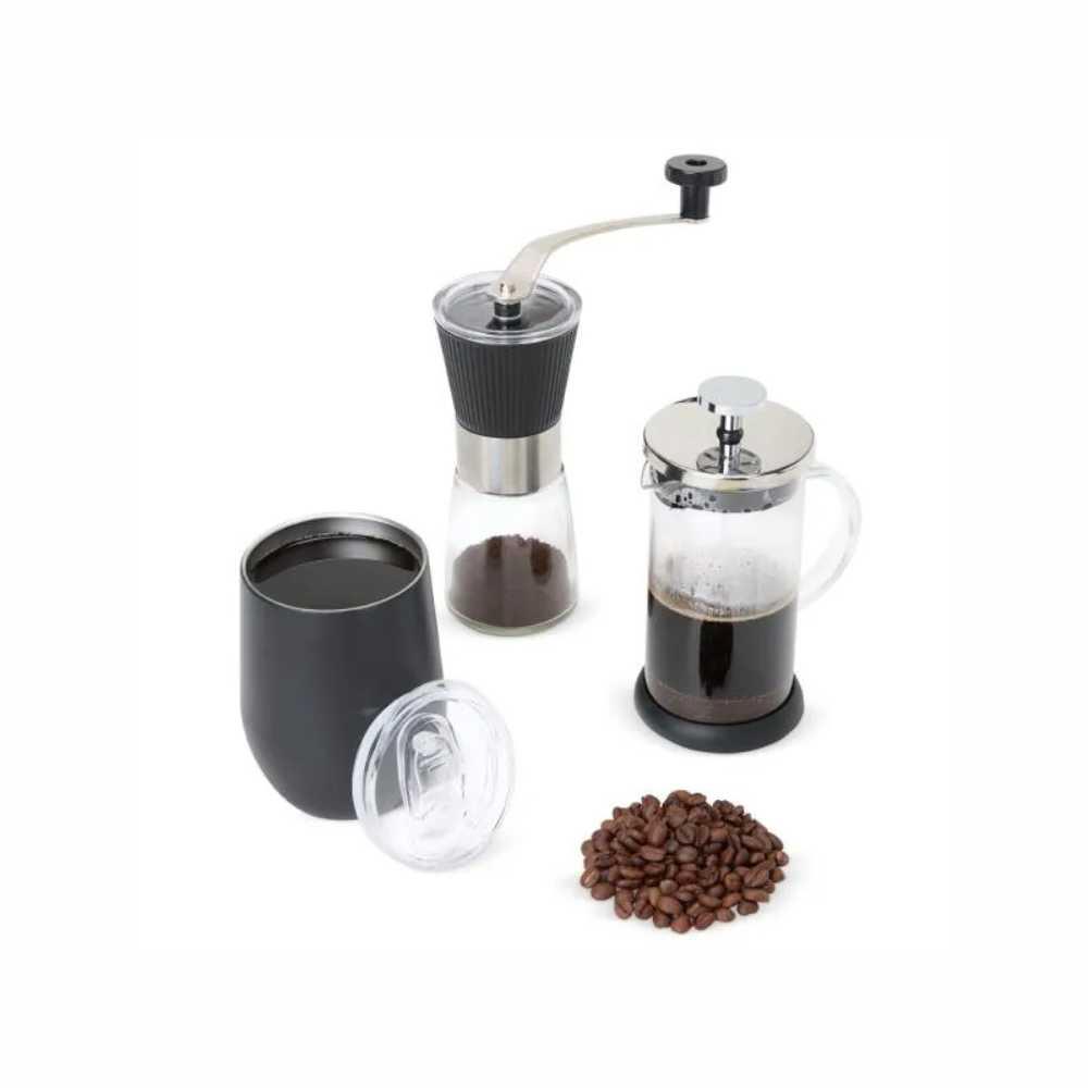 Kit para café com copo térmico. Composto por cafeteira prensa francesa em vidro; moedor para café confeccionado em Vidro/Inox e copo térmico com tampa 340ml, confeccionado com dupla parede de inox, isolada a vácuo.